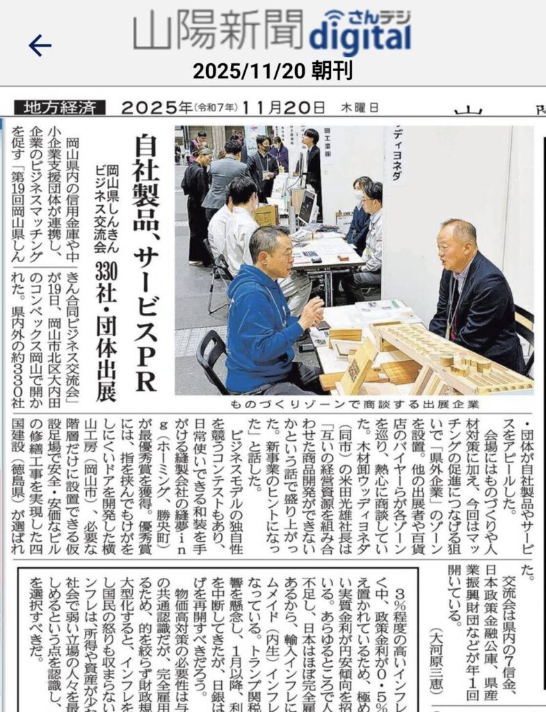 2025.11.25 第19回岡山県しんきん合同ビジネス交流会 出展 ウッディヨネダは岡山県内の信用金庫や中小企業支援団体が連携し、企業のビジネスマッチングを促す「第19回岡山県しんきん合同ビジネス交流会」に出展いたしました。県内外の約330社・団体が自社製品やサービスをアピールし、出店者やバイヤーが各ゾーンを巡り熱心に商談が行われました。